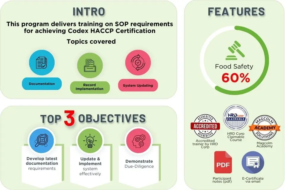 Get ready to dive into our Developing an Effective Codex HACCP (2023) Documentation Training! Join us for this enjoyable and informative training, and become a food safety hero in your workplace! Together, we can ensure a safer food environment for everyone!