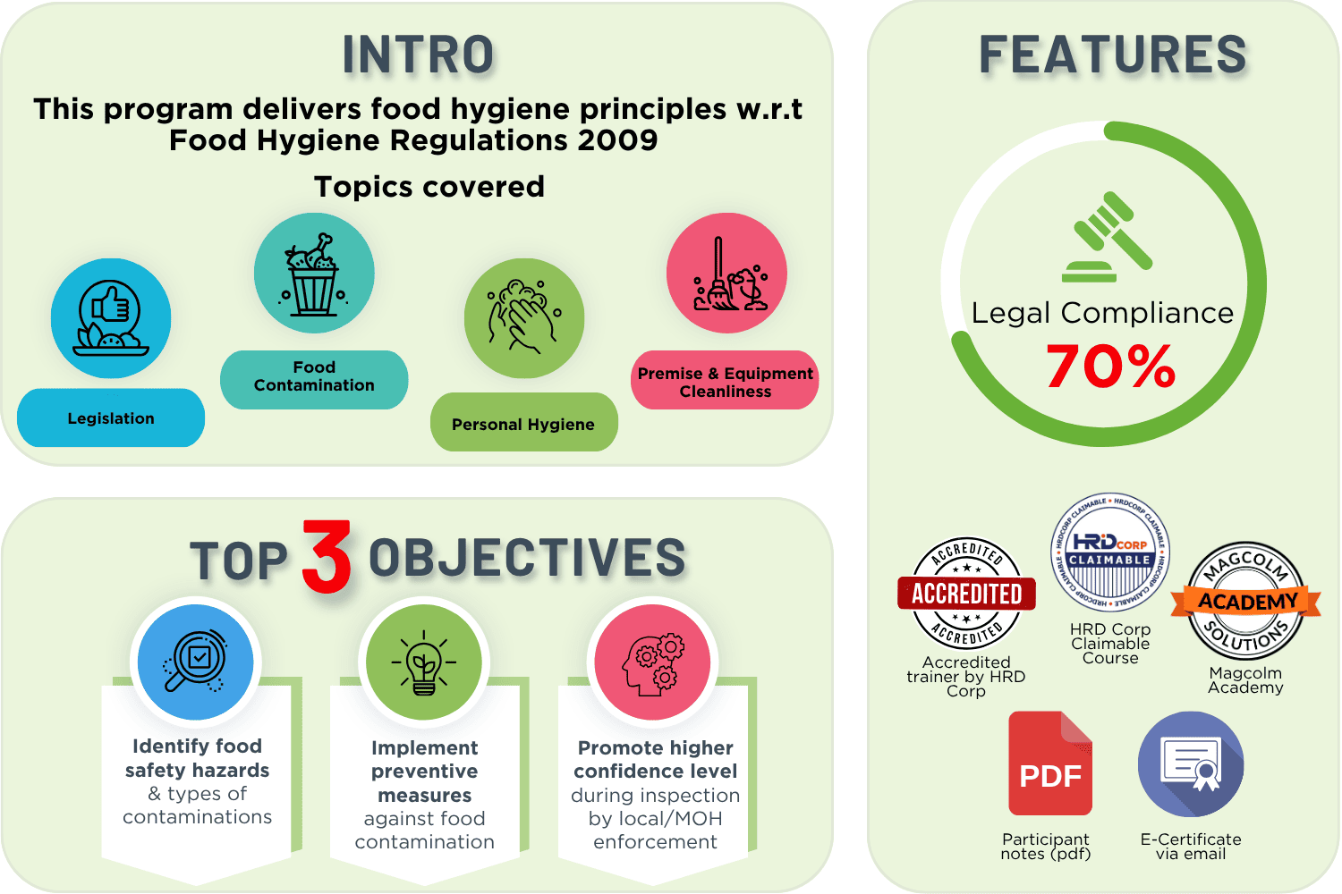Our Corporate Training programs are your essential stepping stones for your staff and organization to understanding best practices in food safety, quality, environmental management, occupational safety and health and halal compliance. This is where confident compliance and effective practices begin!